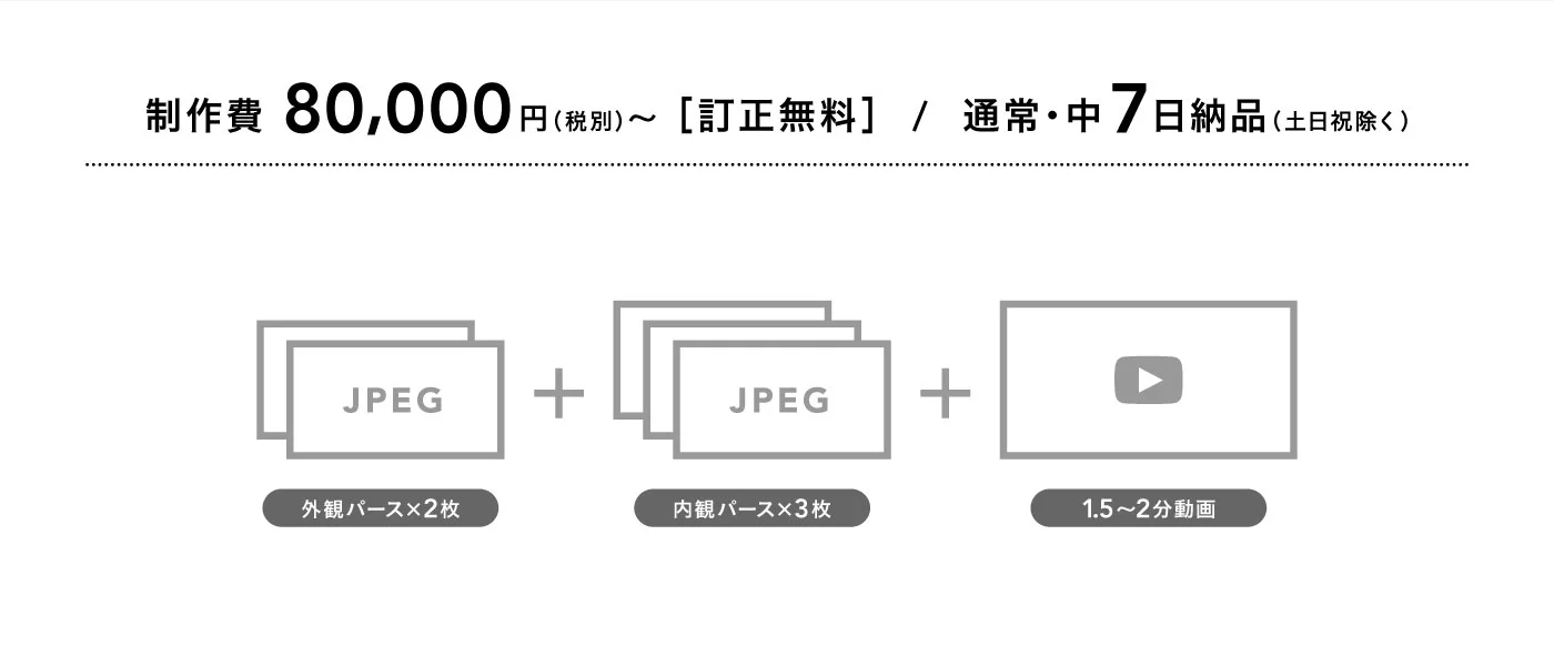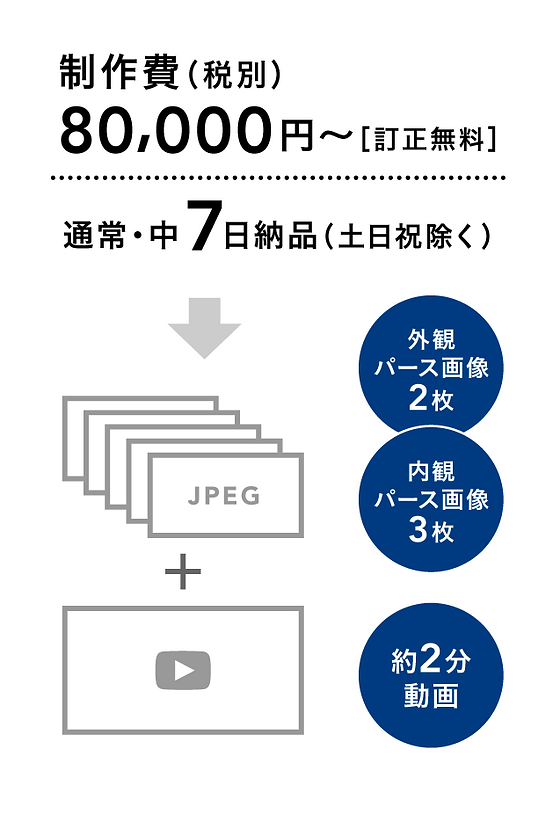 マンション・一戸建単体はもちろん、事務所スペースや他区画の現場にも対応。打ち合わせで仕様がまとまったら数日※で、まるで完成後の建物内外を撮影したかのようなウォークスルー動画が完成。